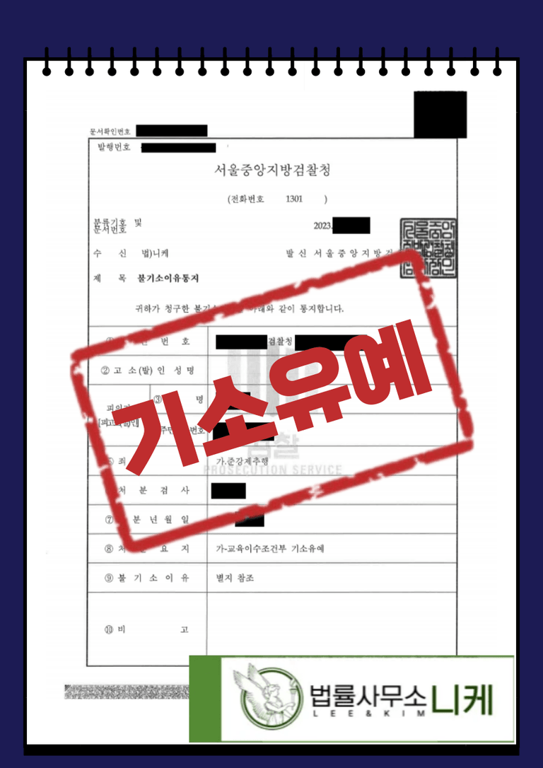 그 결과 의뢰인은 준강제추행 혐의를 받고 법정형으로 최소 벌금형 최대 10년 이하의 징역형을 선고받을 수 있었음에도 불구하고 기소유예 처분을 받을 수 있었습니다.