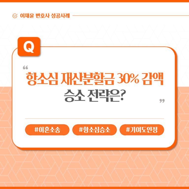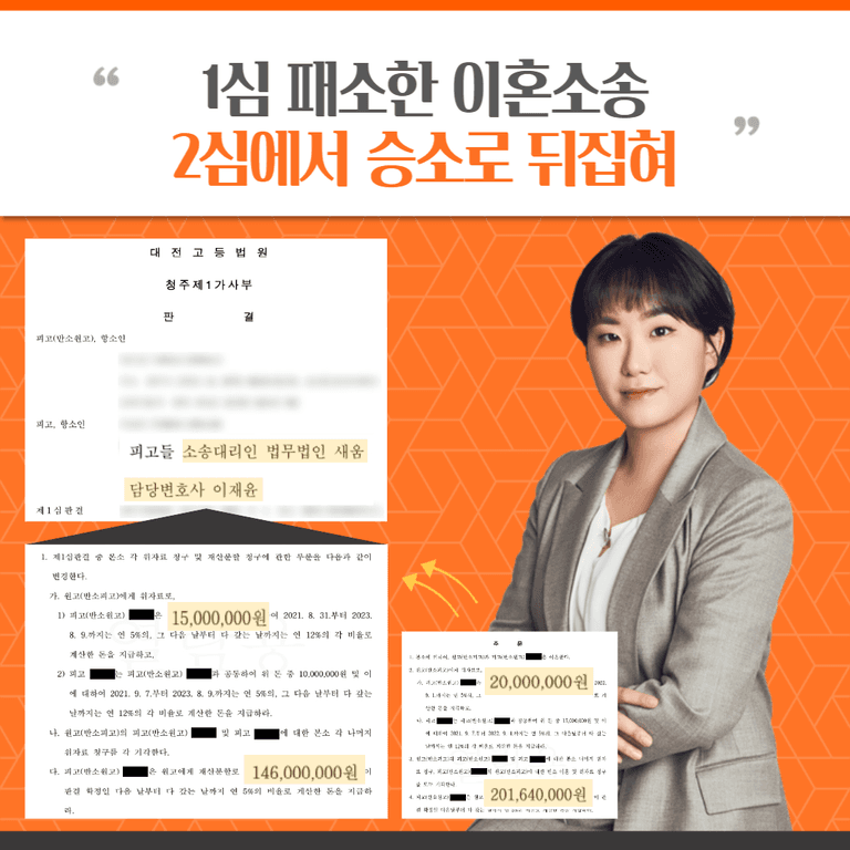 의뢰인은 타 법무법인에서 1심을 진행하였는데, 위자료 2,000만 원, 재산분할 상대방 청구 모두 인용이라는 결과에 실망하여 2심 진행을 위해 본 법무법인을 방문하였습니다.