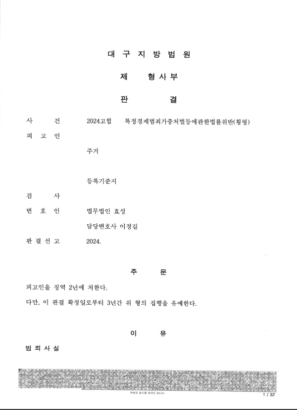 저는 즉각 이 사건의 경위, 피고인의 가정환경, 피해 일부 회복, 나머지 피해회복 의지(피고인이 피해자에게 공증을 작성하여 줌) 등을 중점적으로 주장 입증하였고 법원은 집행유예를 선고하였습니다.