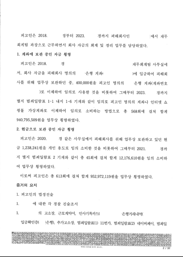 의뢰인은 피해자 회사의 경리로 일하면서 수 년에 걸쳐 9억 원이 넘는 거액을 횡령하여 적발되어 기소되었습니다.