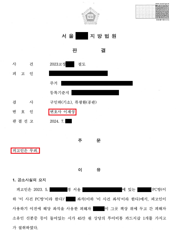 특히 이 사건은 의뢰인의 행동이 찍힌 CCTV 영상까지도 증거로 제출되었던 사건이라는 점에서, 관련자들을 전부 증인으로 소환하고 치열한 사실관계 다툼을 통해 무죄를 받은 이 사건은 변호인인 제 입장에서도 매우 의미가 큰 사건이었습니다.