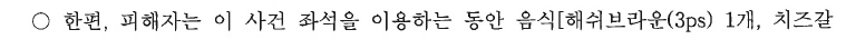 1) 루이비통 지갑에 대한 절도피해를 신고한 전 이용자(이하 '신고자')는 해당 좌석에서 해쉬브라운, 치즈갈릭포테이토 등 하얀색 용기에 담아져 나오는 음식물을 주문하여 그 좌석에서 섭취하였음.