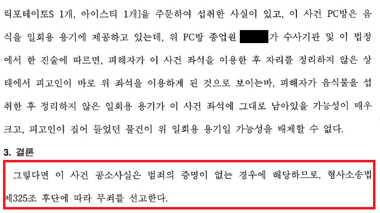 7) 무엇보다도, 신고자가 실제로 해당 좌석에 지갑을 올려놨는지 여부에 대하여는 수사기관에서 CCTV 영상을 전혀 확인한 사실이 없었고, 이에 대한 증거는 오로지 신고자의 진술이 유일함. 그러나 신고자는 지갑을 잃어버린 즉시 신고를 한 것이 아니라 약 24시간이 지난 다음 날 PC방을 방문하여 CCTV 영상을 본 이후 경찰에 신고를 했기 때문에, 정황상 신고자가 지갑을 잃어버린 장소 자체를 착각했을 충분한 가능성이 있음.