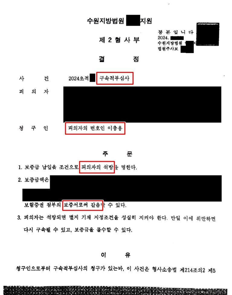 재판부는 변호인의견서를 전부 받아 들이고, 의뢰인에 대하여 보증금 납입을 조건으로 석방을 명하는 결정을 하였습니다.