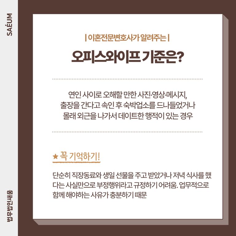 법원이 인정하는 오피스 와이프의 기준은 누가 보더라도 연인에 가까운 행위를 하였을 때입니다. 가령 사회통념에 비추어 보았을 때 충분히 연인 사이로 오해를 할 만한 포즈를 취한 사진이나 영상을 남겼거나, 사귀는 관계에 주고받을 만한 문자메시지, 혹은 카카오톡을 남겼다면 외도의 근거로 활용될 수 있습니다.