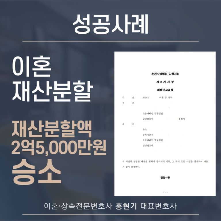 그 결과 법원에서는 의뢰인에게 2억 5,000만원의 재산분할을 지급하고, 동시에 피고 소유의 주택 지분 1/2에 대하여 의뢰인에게 소유권이전등기절차를 이행하라는 판결을 내리게 되었습니다.