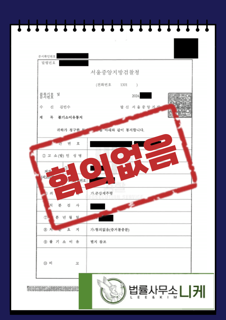 그 결과 의뢰인은 준강제추행 혐의를 받고 법정형으로 최소 벌금형 최대 10년 이하의 징역형을 선고받을 수 있었음에도 불구하고 혐의없음 처분을 받을 수 있었습니다.