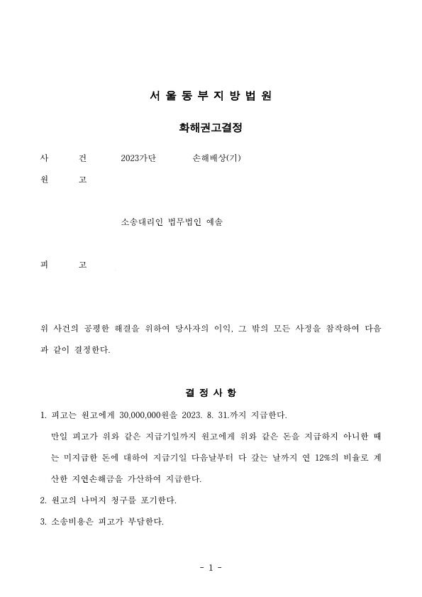 상간남의 청구인낙 답변서의 제출로 법원에서‘원고의 청구금액30,000,100원 중30,000,000을 인용’하고‘소송비용 또한 피고(상간남)가 부담’하는 내용 화해권고결정을 내려,그와 같은 화해권고결정이 확정되었습니다.