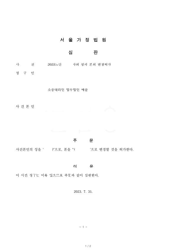 의뢰인은20년 전 이혼 후,재혼한 상태에서 성인이 된 자녀의 성과 본을 재혼한 계부의 성과 본으로 변경을 원하였습니다.