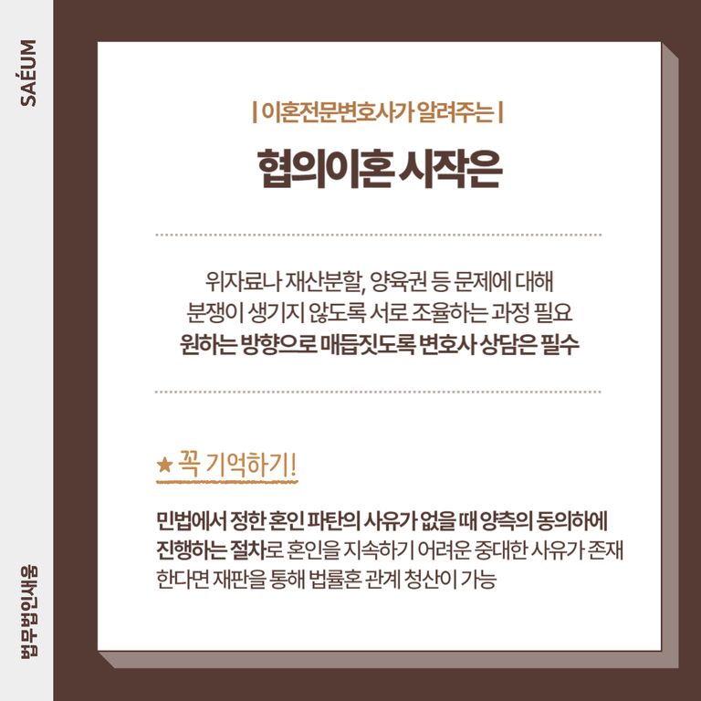 여기에 해당하는 특별한 사유가 없더라도 당사자 간에 혼인을 정리하기로 합의가 되었다면 협의를 통해 법적으로 정리가 가능합니다. 다만 이때 세부적인 사항들에 대해서도 합의가 필요한데요.