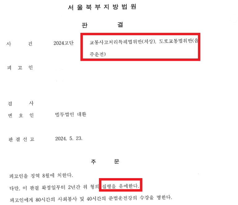 법무법인 대환은 당시 음주운전은 숙취운전이었고 사고의 정도가 경미하며 피해자들과의 합의 및 보험처리 또한 적극적으로 진행하여 실형 선고가 아닌 집행유예 판결 선고를 받을 수 있었습니다.