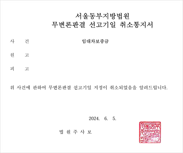 본 사건 무변론판결 선고기일 취소통지서