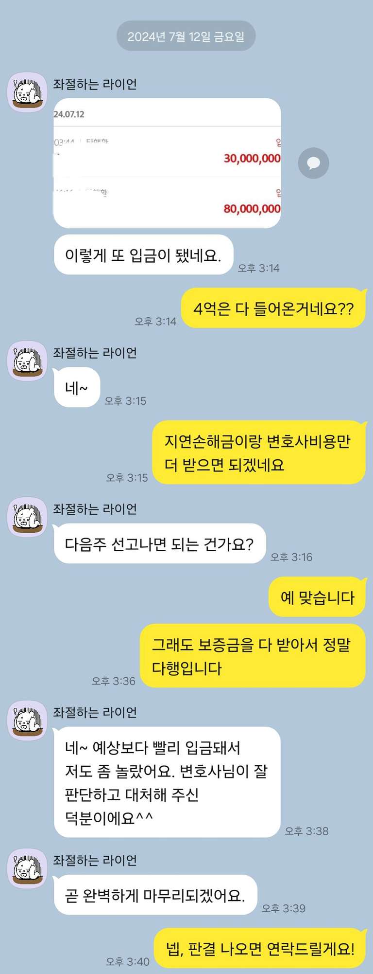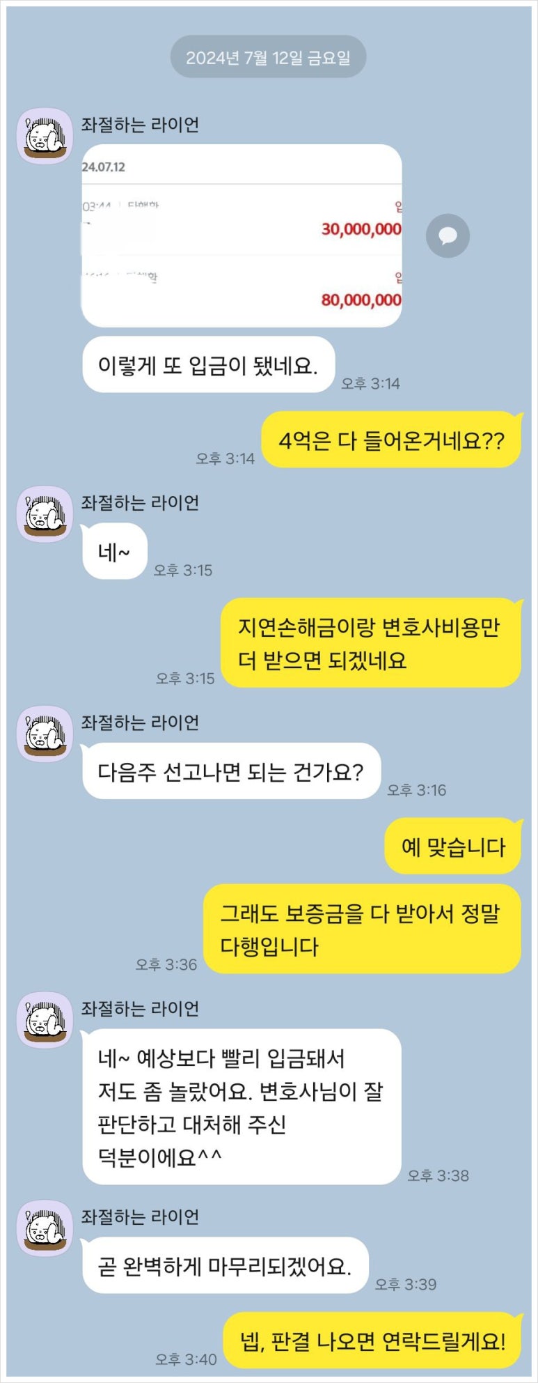 * 8월 초: 지연손해금 및 변호사비 약 2,000만원 추가 회수