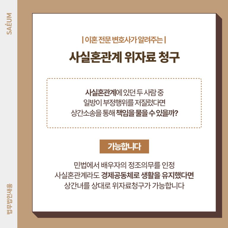 결론적으로 답변을 드리자면 충분히 가능합니다. 한국 민법에서는 배우자의 정조의무를 인정하고 있어서, 사실혼 관계라 하여도 엄연하게 부부와 마찬가지의 경제공동체로 생활을 유지하였다면 상간녀를 상대로 위자료청구가 가능합니다.