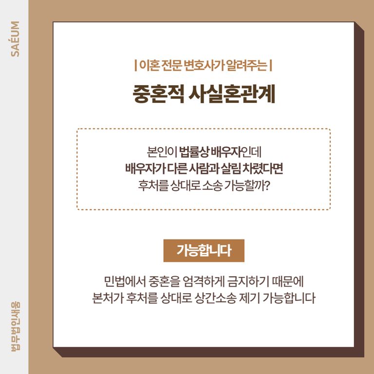 즉 두 집 살림을 차린 것을 의미하는데요. 민법에서는 중혼을 엄격하게 금지하기 때문에 본처가 후처를 상대로 상간녀소송을 제기해야 합니다. 만일 법률상 배우자가 존재함을 알고도 자신 역시 사실혼 관계라며 권리를 주장한다면, 오히려 상간녀임을 인정하는 꼴이 되기 때문에 위자료 청구의 소송에서 승소할 가능성이 높습니다.