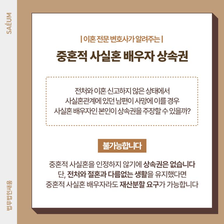 앞서 설명한 대로, 우리나라는 중혼적 사실혼을 인정하지 않기 때문에 원칙적으로 상속권이 없습니다. 본처에게만 법적 권리 의무가 발생하는데요. 만일 사망이 아닌 이혼이라면 예외입니다.