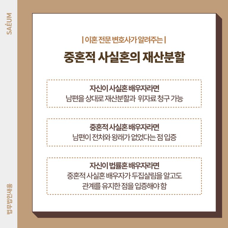 중혼적 사실혼 배우자 위자료 재산분할 까다롭기에 이혼전문변호사와