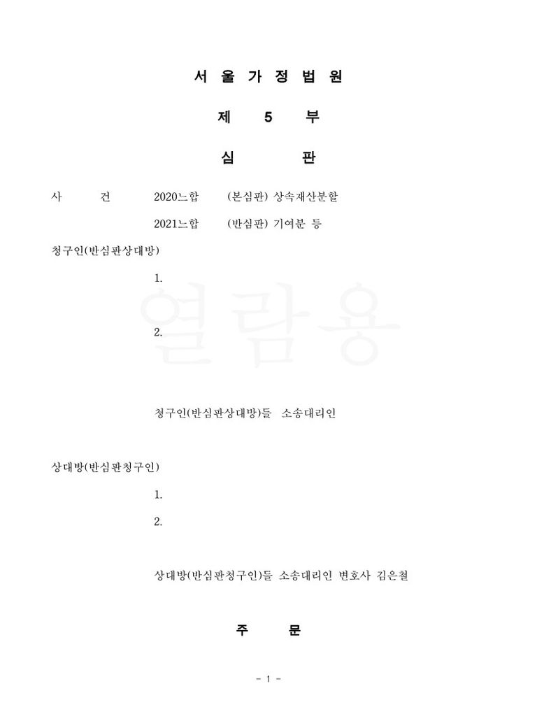 이 사건 소송은 청구인들이 상대방들을 상대로 하여 상속재산분할 심판을 청구한 것에 대해 상대방들이 기여분을 주장하면서 청구인들을 상대로 상속재산분할 반심판을 청구한 사안인 것인데, 청구인들은 피상속인의 자녀들이고, 상대방 갑은 피상속인의 배우자, 상대방 을은 피상속인의 子이었습니다.