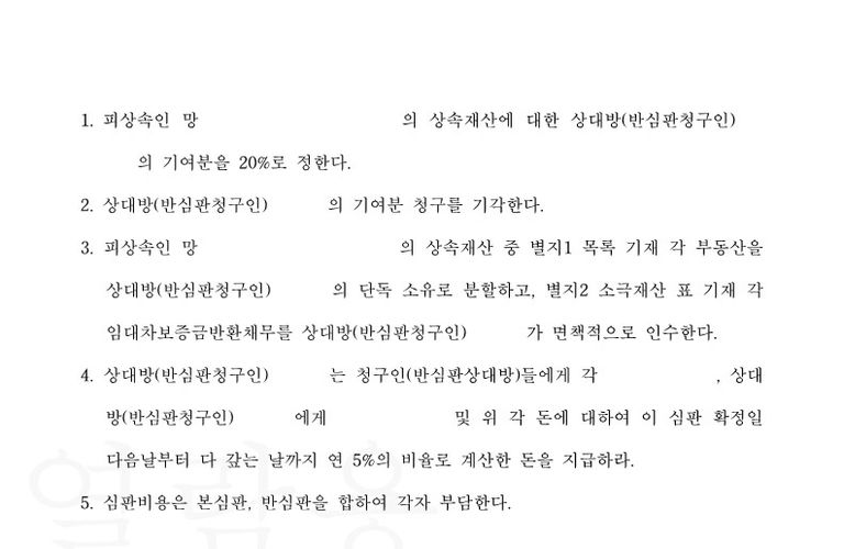 법원은 상대방들 소송대리인의 위와 같은 주장을 받아들여 상대방 갑의 기여분을 인정하는 한편, 상속재산인 부동산을 상대방 을의 단독소유로 하고, 상대방 을이 상속채무를 면책적으로 인수하고, 상대방 을이 청구인들 및 상대방 갑에게 상속재산분할 정산금을 지급하라는 심판을 하였습니다.