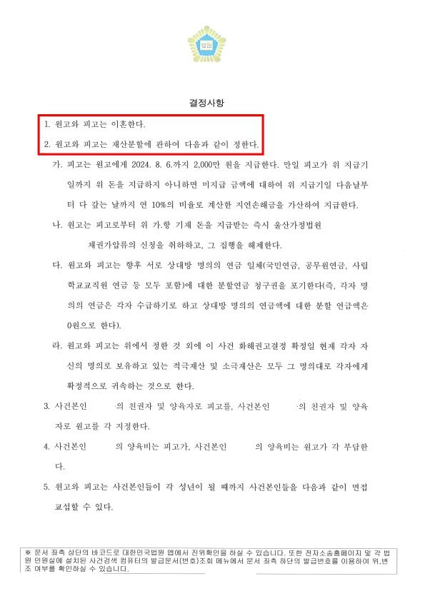 그 결과 울산가정법원에서는 화해권고결정을 내렸습니다.