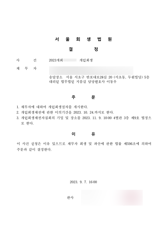 의뢰인께서는 빚을 갚기 위해 투잡으로 벌이 수단을 늘려보기도 하였지만 생활비까지 고정적으로 지출되다 보니 좀처럼 상환액을 줄여볼 수 없었다고 하셨습니다. 결국 대출을 대출로 돌려막다 보니 독촉 등의 추심이 발생할 수밖에 없었고, 독촉을 방지하기 위한 대출을 다시 알아보는 등 반복되는 빚의 굴레에 빠지게 되어 개인회생을 신청하기로 마음먹게 되셨습니다.
