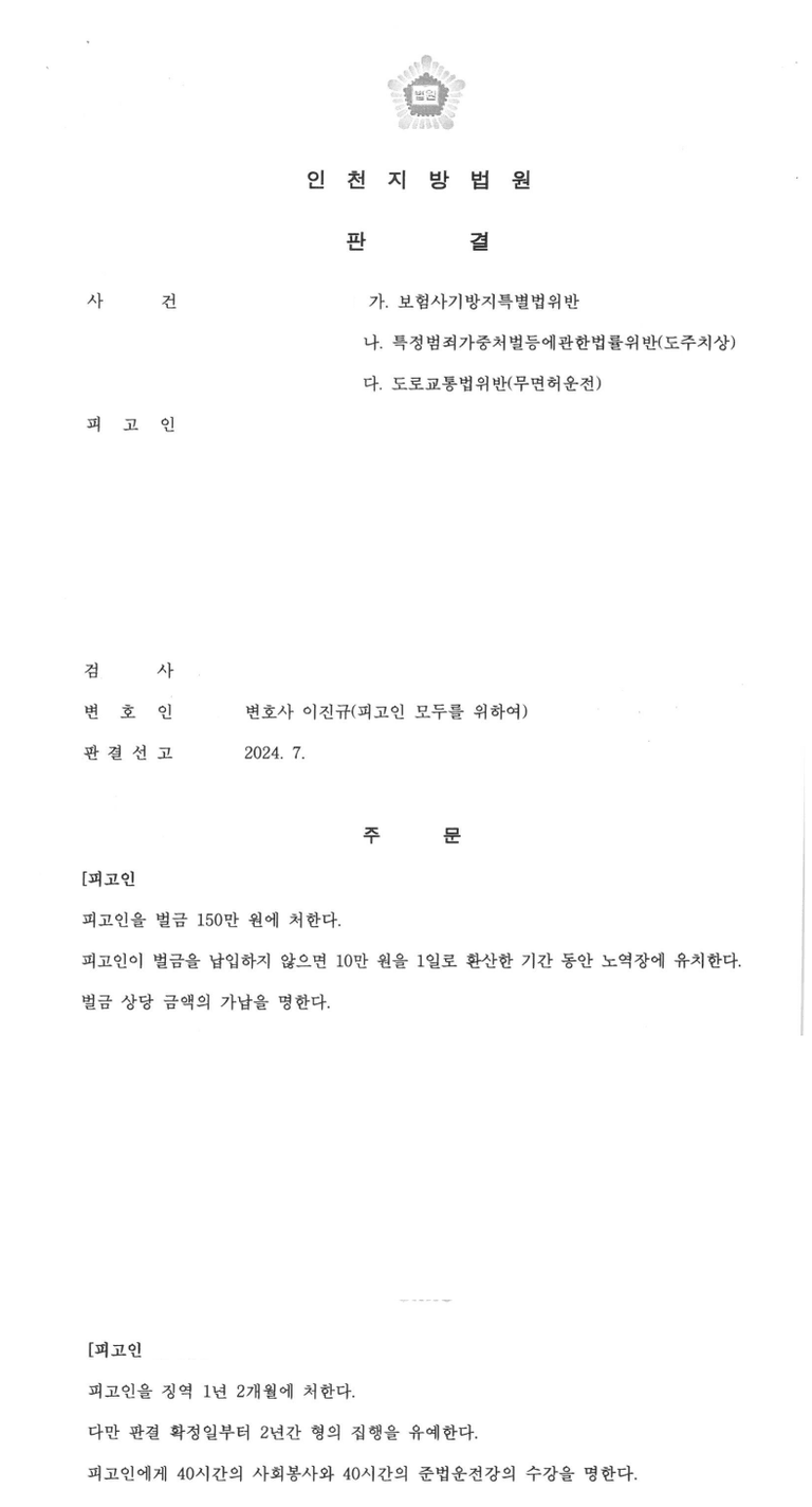 보험사기방지특별법위반, 특정범죄가중처벌법위반(도주치상), 도로교통법위반(무면허운전)으로 입건되어 재판을 받게된 의뢰인분이 집행유예의 선처를 받은 사례입니다.