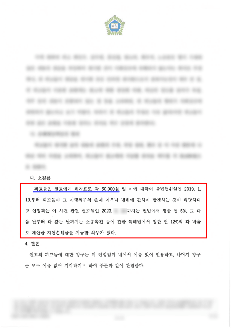 판결문에 '10만 원을 지급하라'라고 나온다면, 소송으로 확정된 금액이기 때문에 10만원 + 연 12% 이자가 붙습니다. 추가로 판결문에 '원고가 소송비용의 100% 혹은 90%를 부담하라'는 항목이 추가됩니다. 피고측 (소장을 받은 사람)의 소송 비용이란, 변호사를 선임한 비용이 되겠죠. 상대방이 소가 300만 원을 청구했을 때까지는 변호사 비용 30만 원을 보전해주도록 법에 나와있습니다. 그 이상은 보전이 불가합니다.