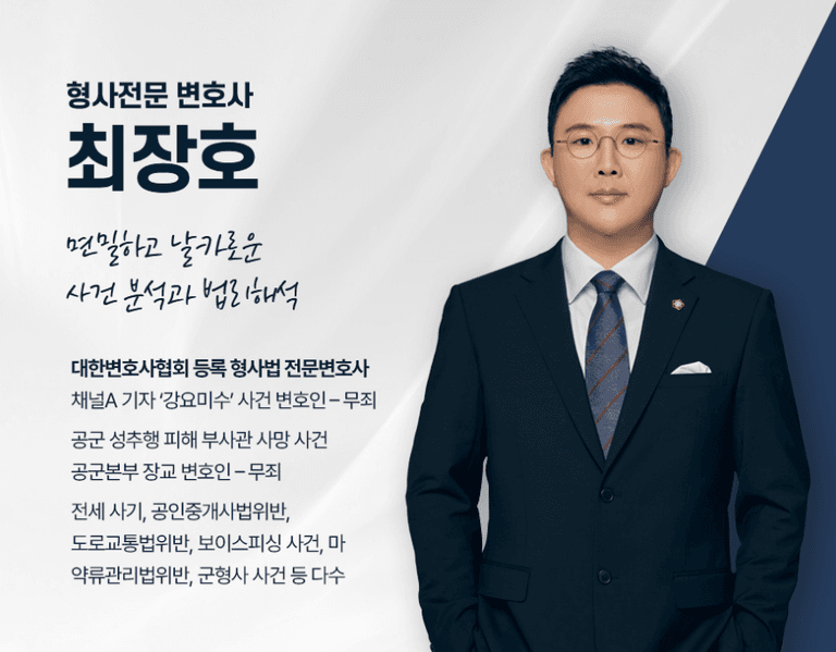 최장호 변호사는 대한변호사협회 등록 형사법 전문변호사로, 채널A 기자 ‘강요미수’사건 변호인(무죄), 공군 성추행 피해 부사관 사망 사건 공군본부 장교 변호인 (무죄), 전세 사기, 공인중개사법위반, 도로교통법위반, 보이스피싱 사건, 마약류관리법위반, 군형사 사건 등 여러 사건을 성공적으로 해결한 경험을 가지고 있습니다. 상담부터 사건 마무리까지 모두 직접 관리하고 있으니 도움이 필요하신 분들은 언제든 연락 주시기 바랍니다.