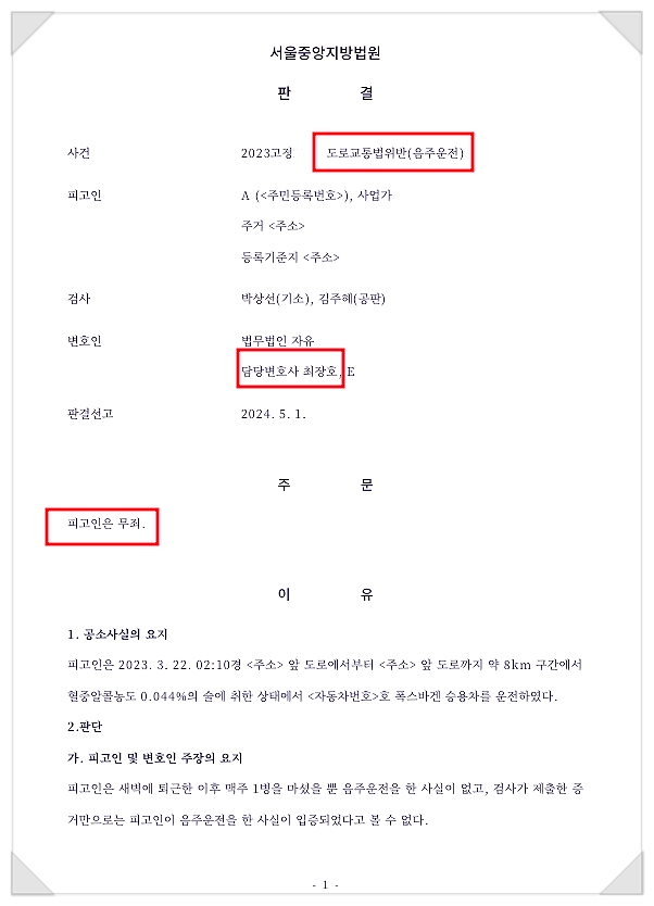 그 결과 법원은 피고인 운전 당시 혈중알코올농도는 0.018%로 0.03%이상의 음주운전에 해당하지 않는다며 무죄를 선고하였습니다.