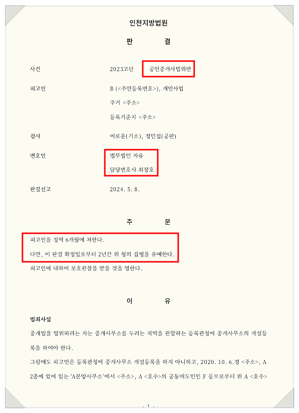 그 결과 법원은 징역 6개월에 집행유예 2년을 선고하였습니다. 전세사기와 관련된 무등록중개로 법정구속까지 가능한 사안이었지만 최장호 변호사가 적극적으로 조력한 결과 의뢰인이 법정구속을 피할 수 있었던 성공사례입니다.