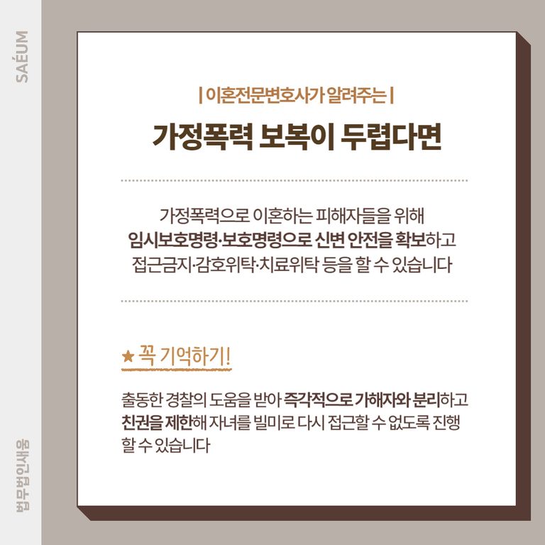 오랫동안 상대방의 폭행에 노출이 되었다면 가정폭력 이혼을 하는 것 자체가 부담이 될 수 있습니다. 혹시나 이혼청구를 하게 되면 상대방이 본인이 거주하는 곳이나 직장을 찾아와 해코지를 하고 위협을 하는 것은 아닐까 하는 두려움을 겪기 때문인데요. 우리나라에서는 가정폭력 이혼을 하고자 하는 피해자들을 위해서 임시보호명령이나 보호명령을 통해서 신변의 안전을 확보할 수 있도록 하고 있습니다. 가해자의 접근금지는 물론이고 감호위탁, 치료위탁 등을 할 수 있으며 구치소에 구금을 하거나 출동한 경찰의 도움을 받아 즉각적으로 가해자와 분리하여 도움을 받아볼 수 있습니다. 이외에도 친권을 제한하도록 하여 자녀들을 빌미로 다시 접근할 수 없도록 막아 안정적인 상황에서 가정폭력이혼소송을 진행해 볼 수 있습니다.