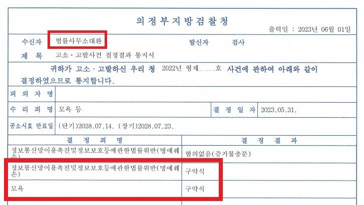 법무법인 대환(법률사무소 대환)은 경찰단계 무혐의 처분에 대하여 이의신청하였고, 검찰단계에서 피의자의 비방의 목적 및 내용의 허위성을 꼼꼼하게 입증한 끝에 검찰에서 해당 주민에게 명예훼손과 모욕 죄명 모두 인정하여 구약식 약식기소(벌금) 결정된 사안입니다.