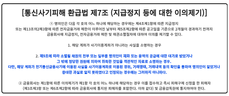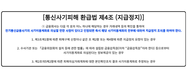 이 부분은 전기통신금융사기 피해 방지 및 피해금 환급에 관한 특별법 (통신사기피해환급법)에 나와있습니다.