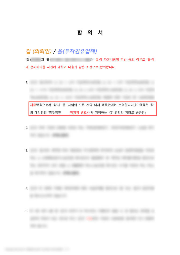 피해금액 환급 방법에는 지급정지 요청, 가압류 등의 몇 가지 방법들이 있으나, 가장 가능성이 높은 방법은 상대방과 합의를 보는 것입니다. 주식이나 코인 등의 투자사기 환급은 일분일초가 시급한 시간 싸움입니다. 보통 범죄조직은 차후 법적인 문제가 생겨도 받은 금원을 보전할 수 있도록 바로 대포통장으로 이체하는 등 다양한 수를 씁니다. 그렇기에 굉장히 정확하고 빠른 대응이 필요한 영역입니다. 하기 문서는 의뢰인을 대리하여 투자 권유업체와 합의를 이끌어낸 후 피해금액을 환급받는 것에 성공했던 합의서입니다.