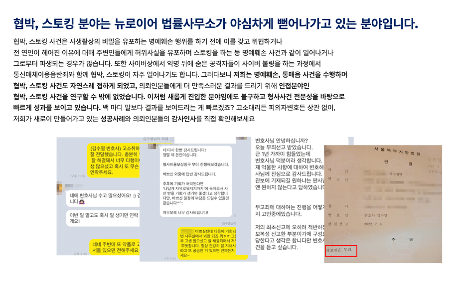 저희는 형사 전문 변호사님을 필두로 사이버 상에서 일어나는 스토킹, 협박, 불안감 조성 등의 사건을 해결해 드리고 있는데요.