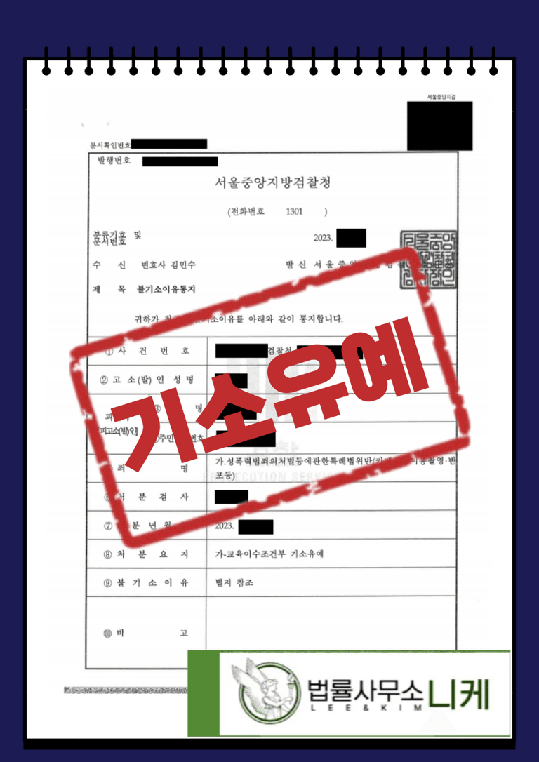 그 결과 의뢰인은 성폭력범죄의처벌등에관한특례법위반(카메라등이용촬영,반포등) 혐의를 받고 법정형으로 최소 벌금형 최대 7년의 징역형을 선고받을 수 있었음에도 불구하고 기소유예 처분을 받을 수 있었습니다.