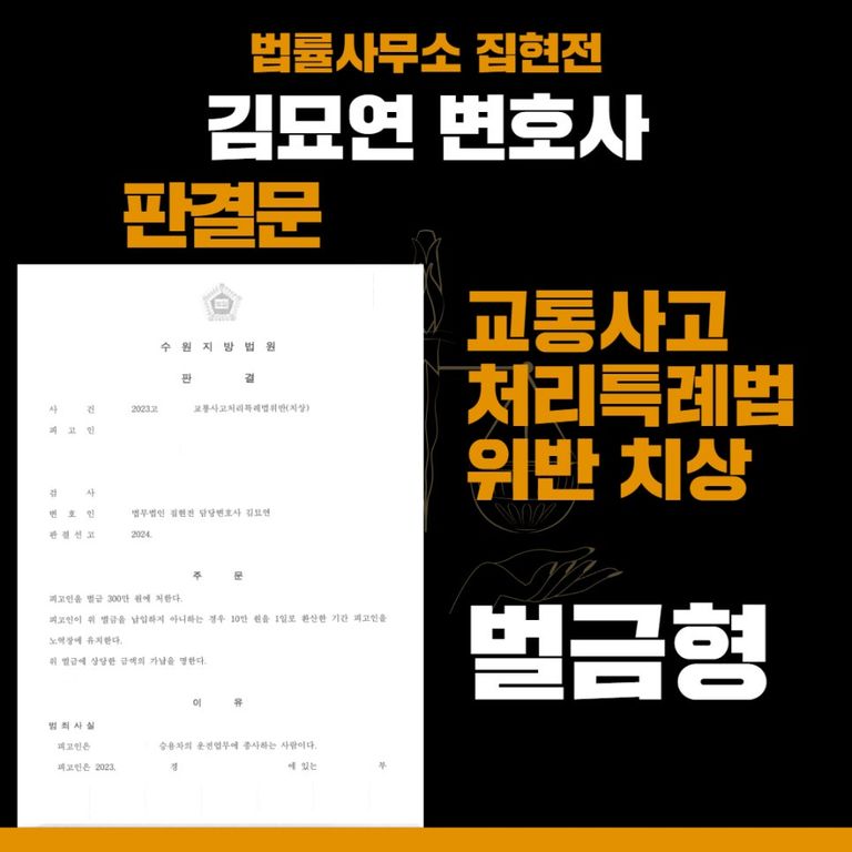 특히, 이번 사안의 경우 의뢰인이 300만 원으로 비교적 적은 금액으로 사건을 마무리 지을 수 있었던 만큼, 교통사고 전문변호사의 법적 조력의 여부가 선처받는 데 지대한 영향을 미쳤다고 할 수 있습니다.