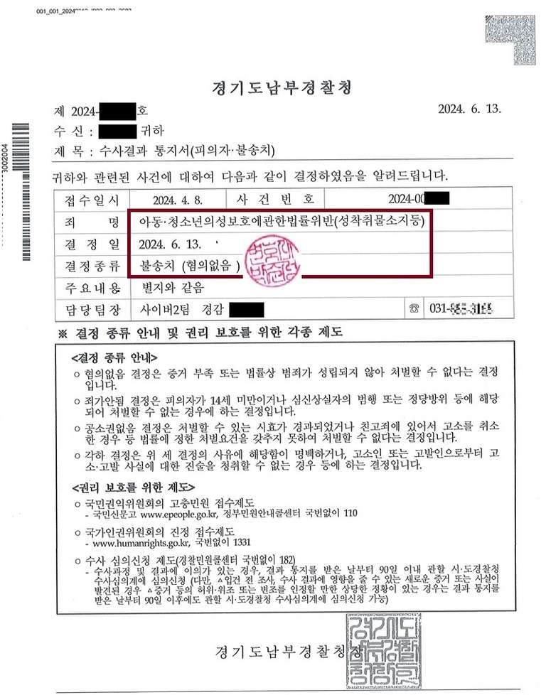 이 사건은 자수로 사건을 시작했음에도 불구하고, 불송치(혐의없음) 결정이 나왔습니다.
