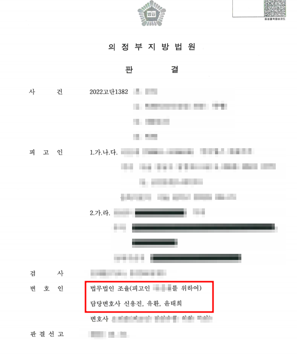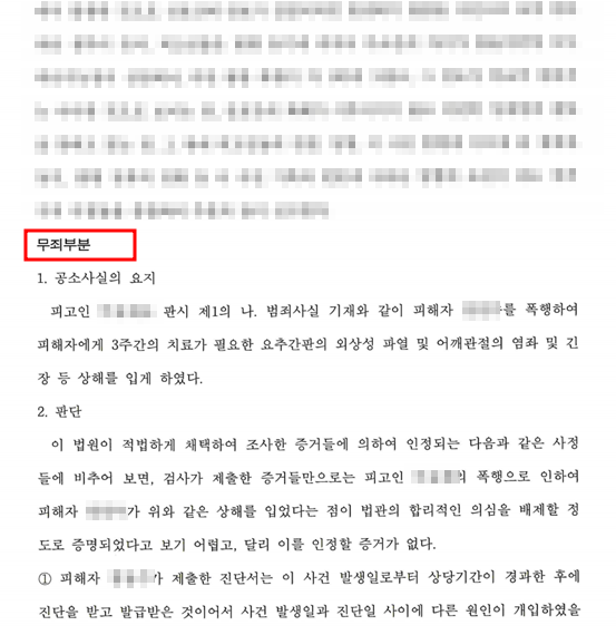 법원 역시 변호인의 의견을 받아들여 폭행과 상해 부분의 인과관계를 인정하지 않음으로써 상해 부분에 대해 무죄를 선고하였습니다.