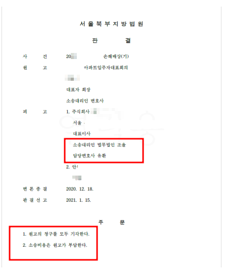 아파트전문 공사업체인 S사를 대리하여 아파트입주대표회의의 부당한 공사대금 청구 소송에서 승소한 사건 입니다. 아파트 입주대표회의에서는 공사범위에 포함되지 않은 부분을 문제삼아 공사업체에게 부당한 공사대금 청구를 제기하였고, 추가로 공사에 하자가 있다는 거짓 하자보수까지 청구한 사안이었습니다.
