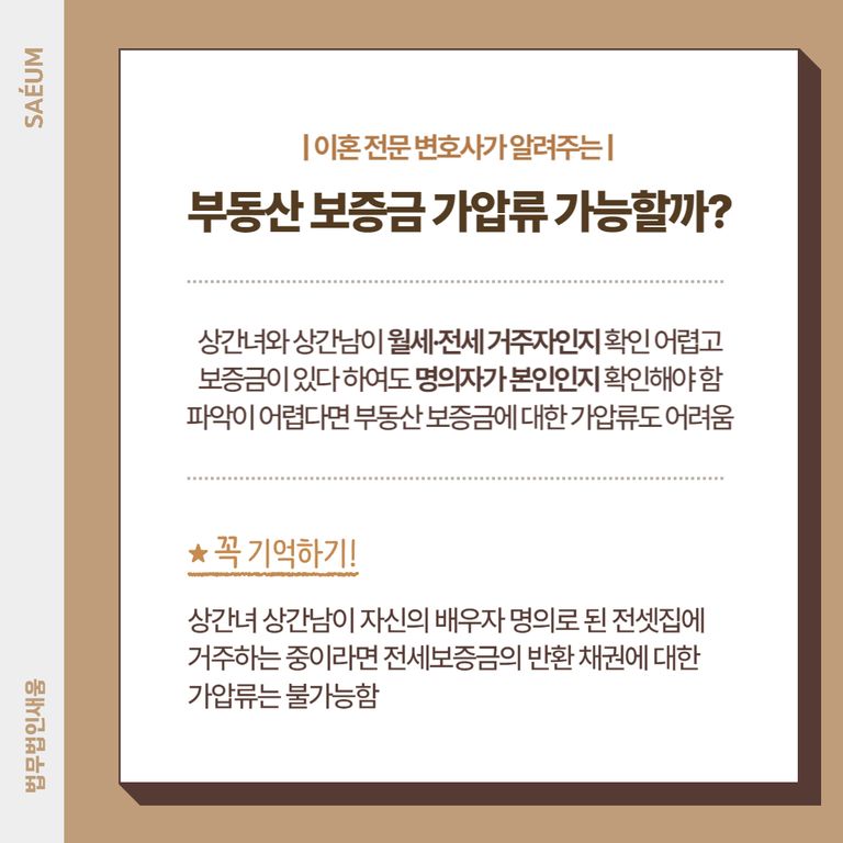 설사 보증금이 있다고 하여도 실제 명의자가 본인이지 확인하기가 어렵습니다. 만일 상간녀 상간남이 자신의 배우자 명의로 된 전셋집에 거주하는 중이라면 전세보증금의 반환 채권에 대한 가압류는 불가능합니다. 결론적으로 명의자, 주거 형태 여부 등을 파악할 수 없으므로, 부동산 보증금에 대한 가압류는 어렵습니다.