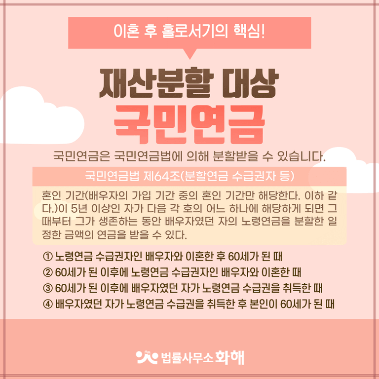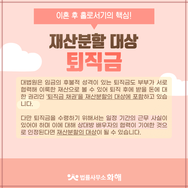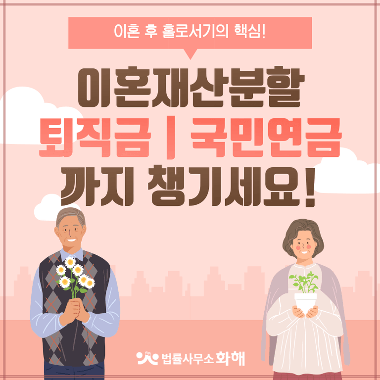오늘은 법률사무소 화해에서 이혼 재산분할 대상 퇴직금, 국민연금에 대해 알려드릴게요.