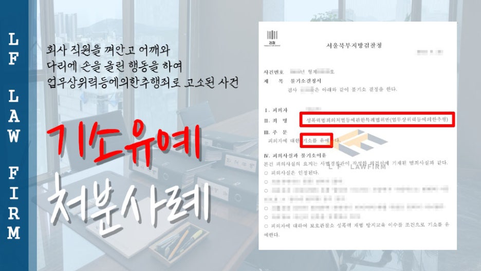 그래서 변호인은 피해자에게 의뢰인이 사과하는 마음을 잘 전달하여 피해자와 원만히 합의하였고, 이에 더해 의뢰인의 양형 자료들을 잘 수집한 뒤 변호인 의견서를 작성하여 수사기관에 제출하면서 직장내성추행 사안에 대해 선처를 받을 수 있도록 변론을 하였습니다. 이렇게 적극적인 조력으로 본 사건에 대해 기소유예를 받을 수 있게 되었습니다.