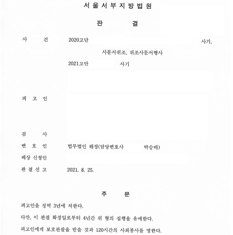 피해액이 2억원을 넘어가는 상황에서 피해자의 절반 가량과도 합의에 이르지 못한 사안이었는데도 불구하고, 피고인의 진심 어린 반성과 후회, 가족들의 탄원과 변호인의 노력이 더해져 일어난 기적과도 같은 결과였습니다.