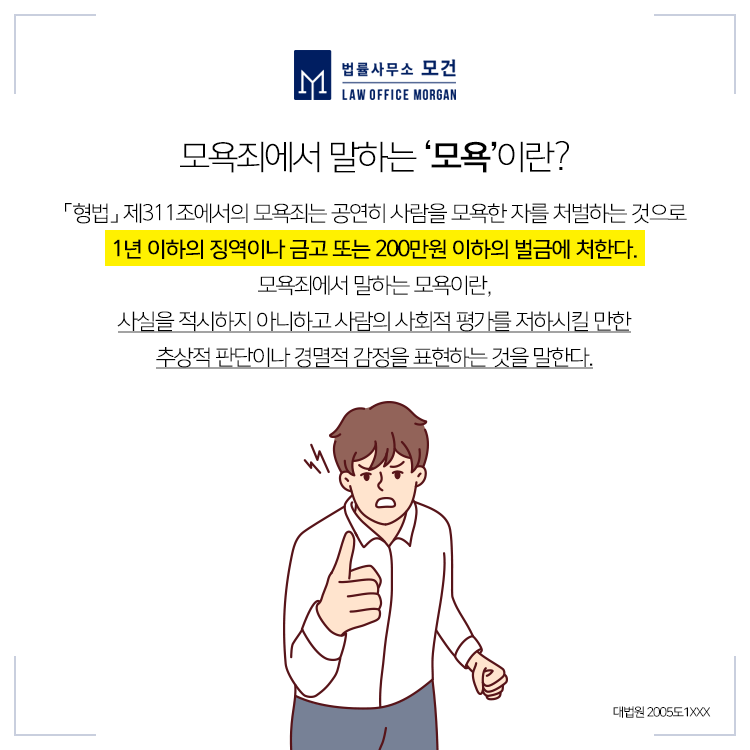 모욕죄 고소장을 받으신 분들이라면 마포형사변호사를 찾아 범죄의 성립요건을 충족하는지 구체적으로 살펴보고, 혐의가 불충분한 때에는 수사 단계에서부터 적극 대응하여 무혐의를 이끌어내는 것이 유리합니다.
