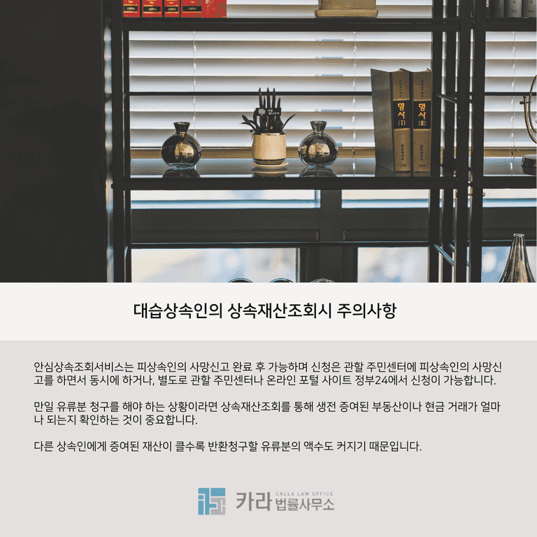 이번 시간에는 대습상속인의 상속재산조회방법 및 주의사항, 그리고 유류분 반환청구가 가능한 조건에 대해 알아보도록 하겠습니다.