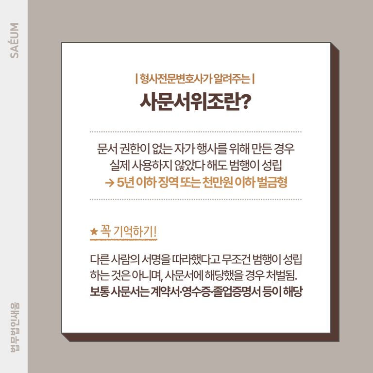의뢰인 A씨는 휴대전화를 개통하는 과정에서 신청서를 작성하면서 고소인 B씨의 명의 및 서명을 위조하고 이렇게 작성된 서류를 대리점 직원에게 제출하여 권리행사를 하게 되었습니다. 이와 같은 행위로 인해서 사문서위조 처벌을 받을 위기에 처하였고, 법무법인 새움을 찾아오셔서 도움을 요청하시게 되었습니다.