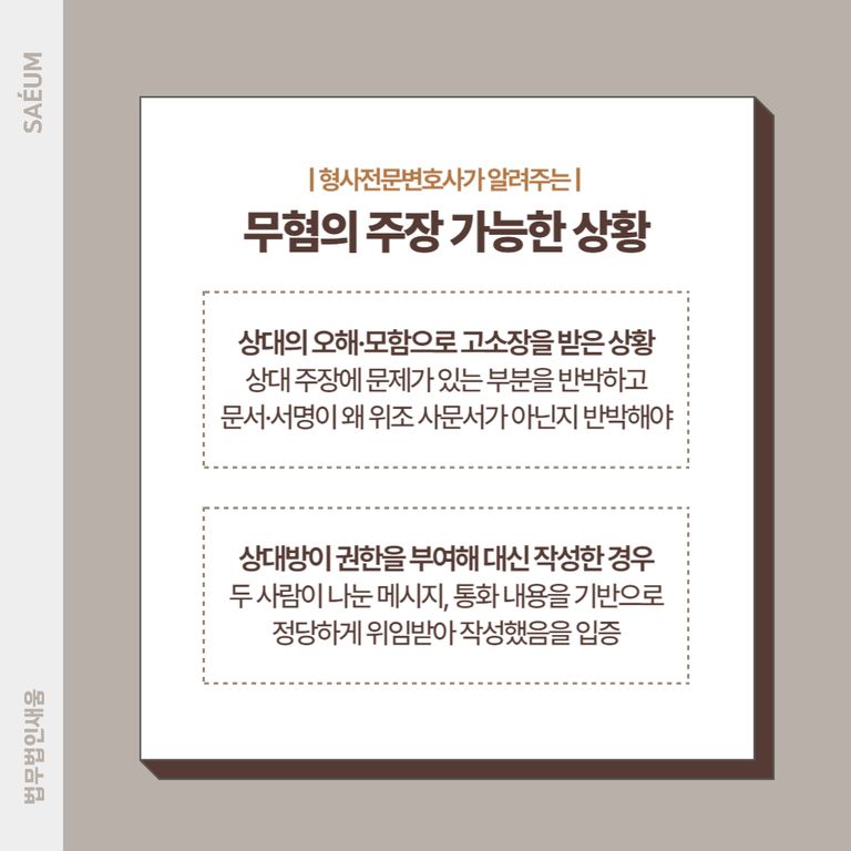 특히 상대방이 권한을 부여하여 대신 작성한 것임에도 이후 문제가 생기자, 자신이 작성한 것이 아니라며 떠넘기는 상황을 주의해야 하는데요. 만일 이런 상황이라면 두 사람이 나누었던 메시지나 전화 통화 내용, 계약서 등을 활용하여 정당하게 위임받아 작성한 것임을 입증해야 합니다.