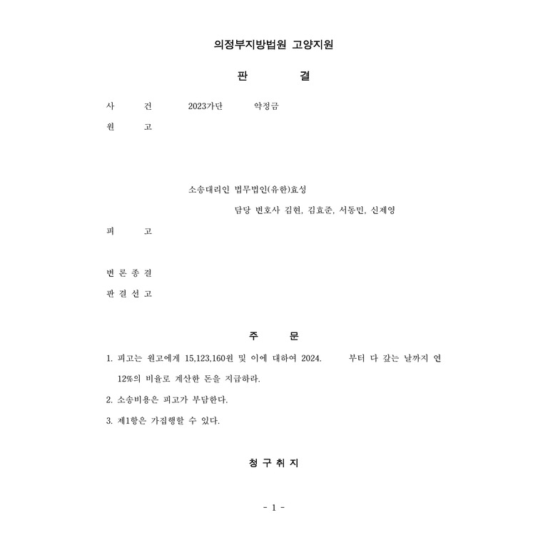 저는 즉각 피고들을 상대로 민사소송 약정금 청구를 하였고, 피고들 중 일부는 소장을 받고 의뢰인에게 금액을 지급하여 소를 취하하였으며, 나머지 피고에 대해 승소하여 의뢰인은 이를 지급받았습니다.