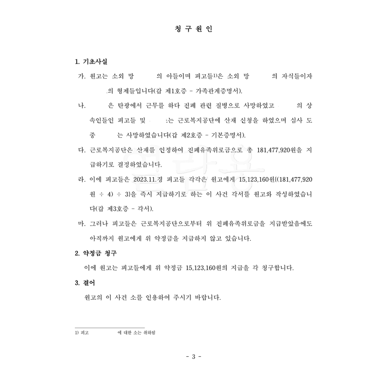 의뢰인은 망인인 아버지가 살아 생전에 형제들인 피고들에 대한 채권을 가지고 있었고 이에 관한 각서 등 처분 문서가 있어 아버지 사망 후 피고들에게 지급을 요구하였으나 피고들이 이를 거부하여 저를 찾아오셨습니다.
